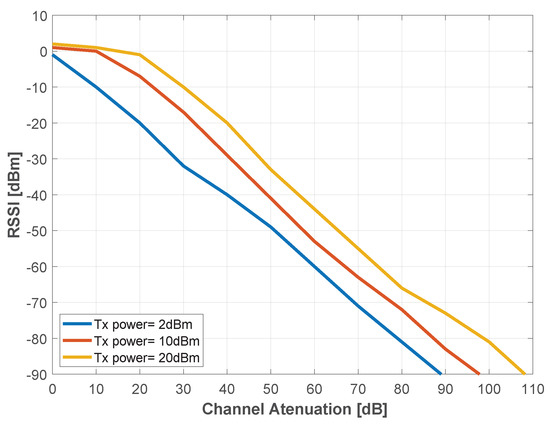 The measurements presented in the following sections are based on the LoPy4 RSSI, which is an indicator of the received power in the device. Since RSSI is not a standardized unit of power measure, there was the need for characterization. Hence, the BS and SN LoPYs were connected back-to-back, in-line with a variable attenuator. The RSSI was then obtained for different values of attenuation. Three values were utilized for the transmission power: 2 dBm, 10 dBm and 20 dBm, while the attenuation varied from 0 to 120 dB, with a step of 10 dB. From the results, depicted in Figure 13, it is possible to observe that with a 2 dBm transmission power, the LoPy4 lost its connection with a line attenuation of 100 dB, while with 10 dBm, the link was maintained until 110 dB of attenuation. For a transmission power of 20 dBm, the LoPy4 could communicate with 110 dB, losing its bind when the line attenuation was of 120 dB.