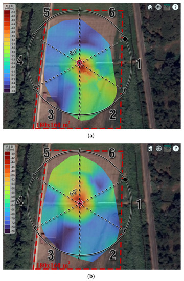 With the aim of validating the proposed sectorization technique, a measurement campaign was carried out, in the field, using the proposed WSN architecture. The field tests were performed in Campos do Liz, Leiria. The location is characterized by vast and large agriculture fields with short vegetation. The BS and SN were placed at a height of 1.6 m in the middle of an open field (with approx. 180 × 160 m). With the BS stationary and utilizing only a single sector active for each measurement, the SN moved around the BS in random pattern, at a maximum distance of 82 m. Due to the limit area of study, the BS power was set to 2 dBm, and an attenuator of 20 dB was employed between the Lopy4 and RF switch. After connecting with the BS, the node sends its RSSI and GPS coordinates using the serial port to a computer every second. These data are then processed in real time using MATLAB. The MATLAB script associates the measured RSSI with the respective GPS coordinates obtained by the PyTrack shield, and it saves it in a file for further analysis. Figure 14 depicts the coverage results attained for sector 2 and sector 5, respectively. From the results, it can be observed that the proposed BS configuration acts as desired, covering each sector (of 60) when demanded.