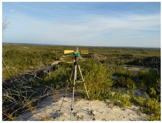 After studying the coverage, the possible maximum range obtained with the presented architecture was evaluated. In order to have a partial Line-of-Sight between BS and SN, an area affected by the fires of 2017 near Poço do Inglês, Marinha Grande was the chosen place for this measurement, as shown in Figure 15. This location is characterized by sand dunes with low vegetation and few remaining burned trees.