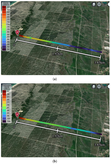 Maximum range campaign: (a) measured RSSI and (b) estimated RSSI using ITM radio propagation model of the proposed WSN.