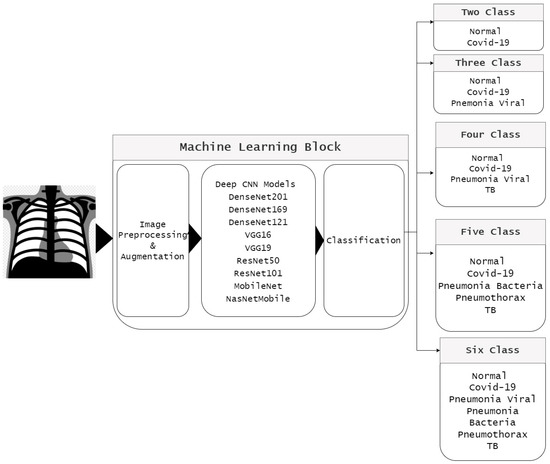 Figure 2 shows a block diagram of the proposed model used to classify COVID-19 and other chest-related diseases. The classification problem is divided into five classes: two-class classifier (normal and COVID-19), three-class classifier (normal, COVID-19, and viral pneumonia), four-class classifier (normal, COVID-19, viral pneumonia, and Tb), five-class classifier (normal, COVID-19, Tb, bacterial pneumonia, and pneumothorax), and six-class classifier (normal, COVID-19, viral pneumonia, Tb, bacterial pneumonia, and pneumothorax). The proposed model is divided into three steps: dataset preprocessing, use of listed pretrained networks, and final selection of pretrained models.