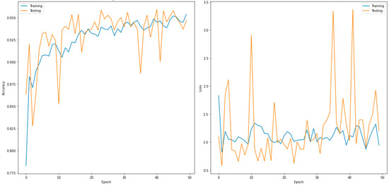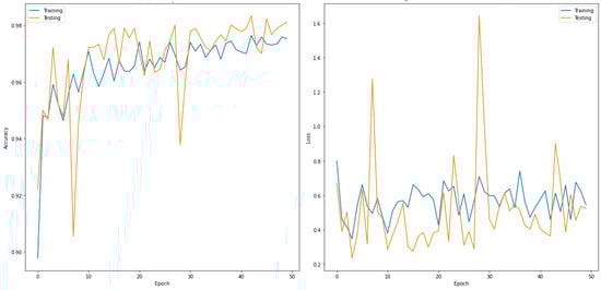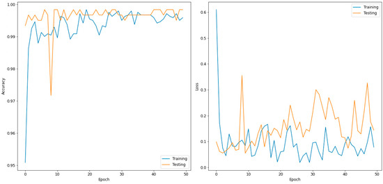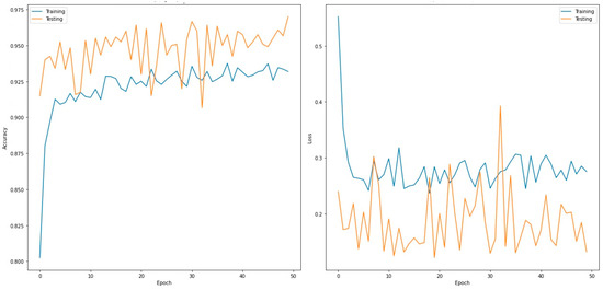 This section presents the evaluated performance of the four-class classifier (normal, COVID-19, viral pneumonia, and TB). Table 8 presents the validation confusion matrix for the VGG19 model, which outperformed the other models. In total, 1200 images were used during the validation phase. These were further divided into 300 input images each for normal, COVID-19, viral pneumonia, and TB. For the normal case, 291 images were correctly predicted as normal, no image was predicted as COVID-19, and seven and two images were misclassified as viral pneumonia and TB, respectively. For COVID-19, 294 images were predicted correctly; one image was incorrectly predicted as normal and another as viral pneumonia, and four images were incorrectly classified as Tb. For viral pneumonia, 283 images were predicted correctly, only 13 and 4 images were incorrectly predicted as normal and COVID-19, respectively, and no image was incorrectly classified as COVID-19. Similarly, 296 images were correctly predicted as Tb, and no images were incorrectly predicted as normal or viral pneumonia, but four images were misclassified as COVID-19. Table 9 shows the performance metrics for the best-performing model for the two classes (VGG19). Figure 5 shows the accuracy and loss curves of the VGG19 model for the two-class classifier over 50 epochs.