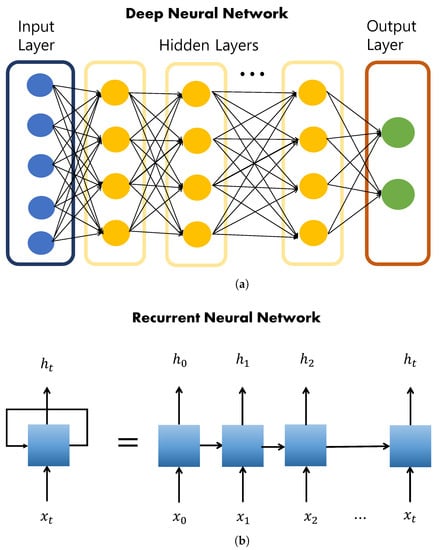 The most basic element in DL is a neural network, which represents the neuronal connection structure among the biological characteristics of the human brain. A network structure modeled after this neural network is called an artificial neural network. An artificial neural network receives learning data from the input layer, processes them using several hidden layers, and outputs the final result through the output layer. A structure in which these neural networks are superimposed is called a DNN, as shown in Figure 1a. A structure that uses an internal cyclic structure to reflect past learning in current learning via weights is called an RNN, as shown in Figure 1b.