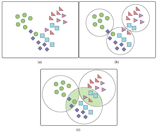 (a) All data X without clustering, (b) partitioning of X by k-means clustering, and (c) covering of X with ADS clustering. Each color represents the data with the same characteristics.