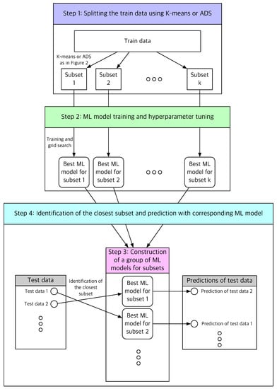 A dataset X is split into training data and test data . In this study, 80% of X is set as . A typical ML or DL method constructs one model that best describes the data in . The novelty of this study is the construction of a group of models for the data in , which is realized as follows. Suppose that the training data is split into using the k-means or ADS method. Specifically, is the partition of if the k-means method is used, and it is a cover of if the ADS method is used.