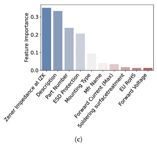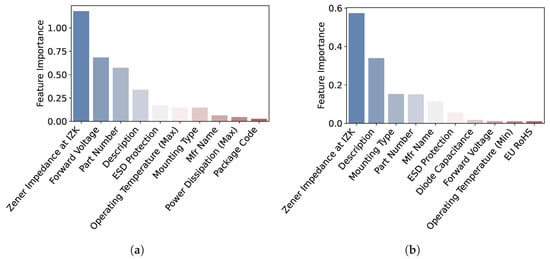 First, we build an actual dataset for this study as follows. The part numbers of the discontinued parts were obtained from QTEC, and their detailed characteristics and specifications were obtained from Z2Data. Among the available data, 2366 parts from the category of Zener diodes were selected and used as the dataset. Although parts from the other categories, such as varactors and bridge rectifier diodes, are available, the amount of information is insufficient for ML. Because the parts produced by different manufacturers have different specifications and characteristics in terms of the content and format, detailed technical information in the data sheets and test reports was thoroughly reviewed and standardized. The data of Zener diodes include 16 numeric and 21 categorical features. Table 2 lists their features and data types.