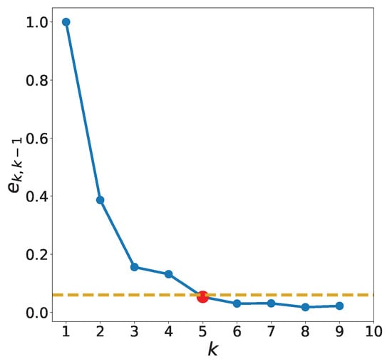and h is a predefined threshold. is introduced to avoid dataset dependency. The minimum value is considered in (5) because a small k reduces the computational cost. Figure 5 shows in (6) for several k values. In this study, is used, and the corresponding optimal k for the dataset is .