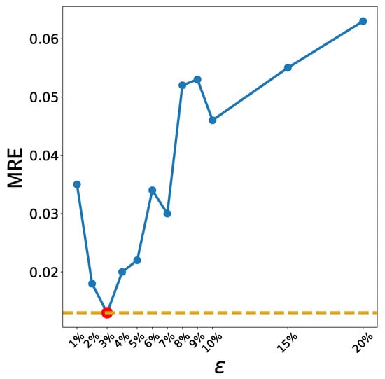 The blue solid line represents the accuracy (MRE) of DT for different radii of ADS for Zener diodes. The yellow dotted line represents the minimum value of MRE, and the intersecting red dot represents the optimal value .