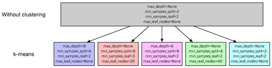 Figure 7 compares the optimal hyperparameters of DT without clustering and 5 sets of optimal hyperparameters for 5 subsets from k-means. Each subset from k-means has different values of hyperparameters. For instance, max_depth for the leftmost data is 8 while that for the data in the middle is 6. Different parameters and hyperparameters for each subset confirm that a single DT model may not be appropriate for the given dataset and that a group of DT models from the proposed method will produce better predictions.