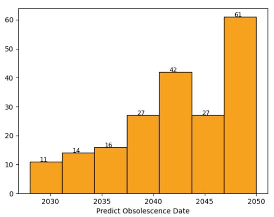 In order to check whether the proposed method is reliable, the method has been applied to the obsolescence prediction of non-discontinued Zener diodes as well. We do not know when the correct obsolescence date will be for the non-discontinued parts, but if the obsolescence dates are predicted to be in the past, the proposed method will be questionable. We collected 198 non-discontinued Zener diodes, and Figure 8 shows the histogram of their predicted obsolescence dates when the proposed method is applied with ADS and DT. All the obsolescence prediction dates are in the future, and none are in the past. Similar results are obtained when the proposed method is applied with other methods, which confirms that the proposed scheme is reliable and not questionable.