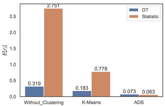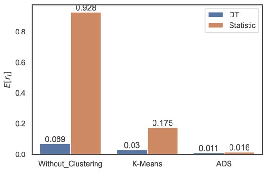 Figure 10 shows the distribution accuracy in terms of the RMSRE, and the results are similar to those of the MRE in Figure 9. The RMSRE error of the DT method without clustering is 0.319 and the error of the statistic is 2.751, which is eight times larger than the former. The error of the DT method with the k-means clustering method is four times smaller than that of the naive statistic. Additionally, the error of the DT method without clustering decreases to 0.183 with k-means clustering and further reduces to 0.073 with ADS clustering. The naive statistic is also improved by the clustering-based regression.