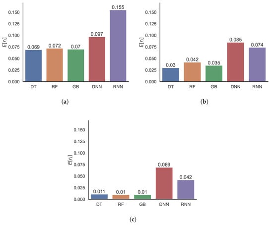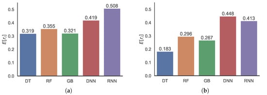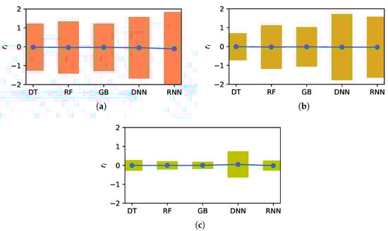 Figure 12 shows the prediction errors in terms of the MREs of various ML methods, namely DT, RF, GB, DNN, and RNN. Figure 12a–c shows the distributions when the methods are used without clustering, with k-means clustering, and with ADS clustering, respectively. The three shallow learning methods—DT, RF, and GB—yield good prediction accuracy, and the results of the two DL methods—DNN and RNN—are slightly inferior. DL typically results in better results than conventional ML methods; however, the insufficient amount of data in this study results in inferior performance.