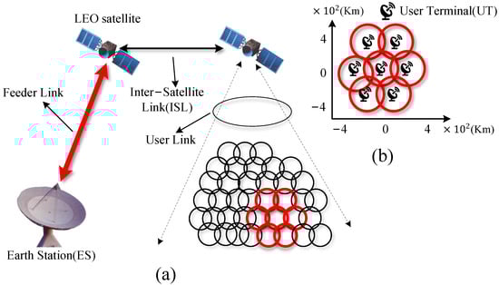 Due to the Internet’s widespread use and the rocket launch and satellite mass production technology, the LEO satellite network has grown to be a significant component of the mobile communication network. Recently, the Third Generation Partnership Project (3GPP) standards group is working on the convergence of terrestrial mobile communication network and satellite networks to support fifth generation (5G) networks [1]. Currently, many companies have put forward their own plans to construct LEO satellite constellations. For example, SpaceX has launched more than 3000 satellites to provide Internet service to people on the ground. Among them, the latest batch of satellites are equipped with laser terminals to establish inter-satellite links (ISLs) with neighboring satellites. The system architecture of a LEO satellite network system, as shown in Figure 1a, consists of the earth stations (ESs), the satellite network, and the user terminals(UTs). Satellites that can establish links with ESs are called visible satellites and the communication links connecting ESs to their visible satellites are called feeder links. One critical function of satellites is to transfer data from satellite networks to ground core network through earth stations (ESs).