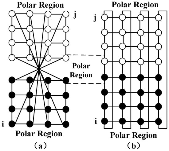 Furthermore, two satellites in neighboring orbits will swap relative positions after traveling over the polar areas, as shown in Figure 2a. When the upper part of Figure 2a is rotated 180 degrees, the topology of the network translates to Figure 2b. In this way, the topology of the LEO satellite network can be modeled as a set two-dimensional mash structure. The dynamic nature of a network topology is principally driven by the establishment of inter-orbit ISLs, as satellites enter and exit the polar area, and by the interference that prevents laser terminals from establishing ISLs due to a high bit error rate.