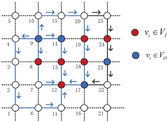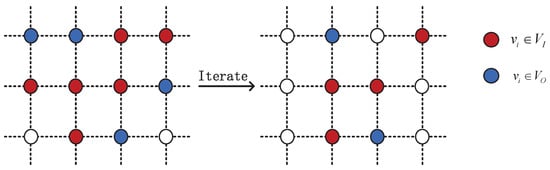 After finishing a round of computations in the preceding sections, it is necessary to update and iterate the network topology because the link status changes, as shown in Figure 5. In order to reduce the iteration rounds and speed up the convergence speed, if the satellites in the set , then the satellites exit the set , changing from a red node to a white node. If the satellites in the set , they will also exit the set , changing from a blue node to a white node. The rest of the nodes of set and repeat the preceding calculation procedure until the number of nodes in set or is NULL, that means, the feeder resources are completely filled and the throughput reaches its maximum. The algorithm terminates the iterative process until the next time slot , at which point it will begin again.