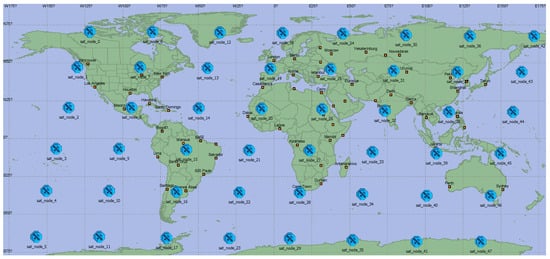 In the simulation scenario, we chose a representative Walker delta, Globalstar constellation. The constellation has 8 orbits with 6 satellites in each orbit, and the angular distance between the planes is 60°. The orbital period is 113 min, and the orbital inclination is 52°. Globalstar satellites are equipped with four laser terminals with a bandwidth of 10GHz for ISL communication, and a 1GHz-bandwidth wireless terminal for communicating with ES, as shown in Table 1. The simulation starts at 8:00:00 UTC on 15 August 2022, and stops at 9:54:00 UTC on 15 August 2022. ES is located in Shanghai, 122.12° longitude and 31.53° latitude.