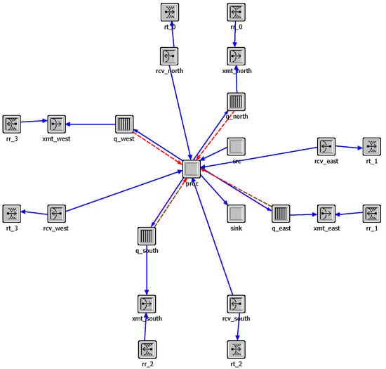 OPNET modeler was used to build our simulation system. First, we import satellite orbit parameters from STK to construct the network scenario model, as shown in Figure 6. After that, we build the node model of the satellite, as shown in Figure 7. The src module is used as the data source to simulate the flow distribution of the user terminal. The proc module serves as the CPU of the satellite and is used to build the network protocol and the algorithm proposed in this paper. The four signal receiving and transmitting terminals serve as laser terminals to establish ISLs with adjacent satellites.