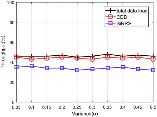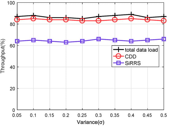 (1) From Figure 9 and Figure 10, it is obvious that our proposed scheme (CDD) outperforms the SIRRS method in terms of throughput. The throughput performance of the CDD scheme remains close to the network load with the change of the data load. In this way, visible satellites can download almost all user data. However, in the simulation using the SIRRS scheme, the system throughput starts to decrease when the network load is heavy. The reason for this phenomenon is when the capacity of feeder links is reduced due to rain attenuation, a large amount of data still needs to be downloaded to ES through these feeder links. When the waiting time of these data in the satellite cache queue exceeds the lifetime, they will be discarded and the system throughput will decrease. The CDD scheme avoids the above situation and makes it perform better than the method that does not use ISL data transfer.