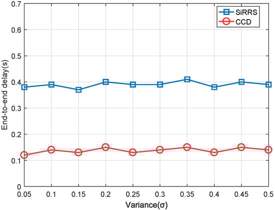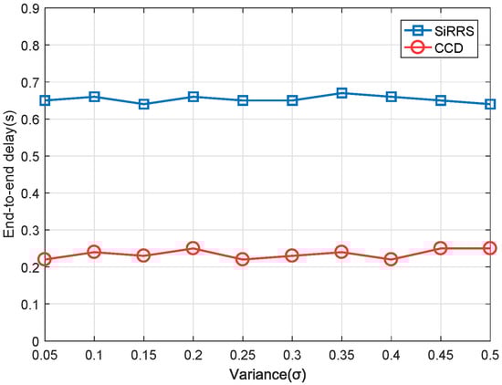 (2) From Figure 11 and Figure 12, our proposed scheme also outperforms the SiRRS method in terms of end-to-end delay. The end-to-end delay obtained by the simulation of this scheme is still about 0.25 s when the network load is very heavy (80–90%). The average delay of SiRRS method is 0.65 s, which means that many packets will become clogged in the cache for longer than their lifetime.