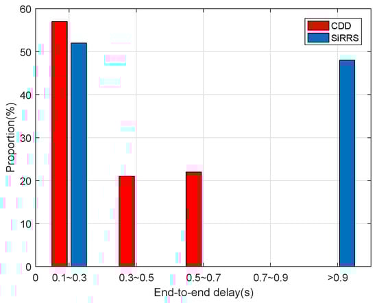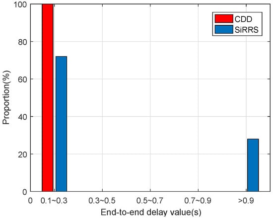 Figure 13 and Figure 14 show the data delay distribution separately under different data loads. As can be seen from Figure 14, when the network load is very heavy, nearly half of the packet delay in the simulation results obtained by SIRRS method is more than 0.9 s, while the packet delay of CDD scheme is all less than 0.7 s. The cause of this phenomenon is that a large number of packets accumulate on feeder links with low capacity, resulting in a dramatic increase in queuing delay in SiRRS method, while the CDD scheme reduces the end-to-end delay of packets by transferring the data to satellites with abundant feeder link capacity.