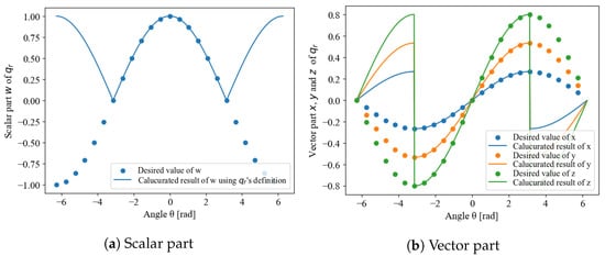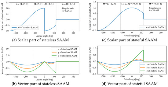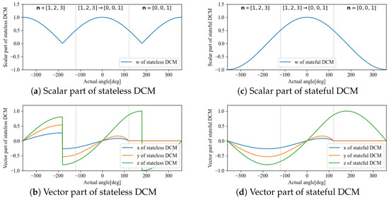 For example, the behavior of each element of with respect to the angle = , when the axis of rotation is , is shown in Figure 1. This simulation was calculated when the initial angle was and was varied continuously up to . The dashed lines are the values that must be taken for the rotor to be continuous, whereas the solid lines are the values calculated from Equation (1). In the range where is , both the scalar and vector parts appear to be continuous, but the vector part cannot be connected because the signs of the values at and are reversed. This discontinuity has a negative impact on the design of time-series or statistical filters; thus, it is necessary to remove the discontinuity to guarantee continuity.