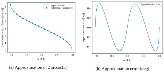 Although could be calculated using only elements and inverse square roots, the arccos operation, a nonlinear function, is required to calculate . Given the use of low-performance MCUs for downsizing wearable sensors and UAVs, the use of nonlinear functions should be avoided as much as possible. Therefore, this nonlinear function is processed by approximation to achieve high speeds. The residual correction method proposed in our previous study [7,8] allowed calculations using only square root operations, as shown in the following equation. When , the maximum approximation error was less than 0.5 deg as showin in Figure 6.
