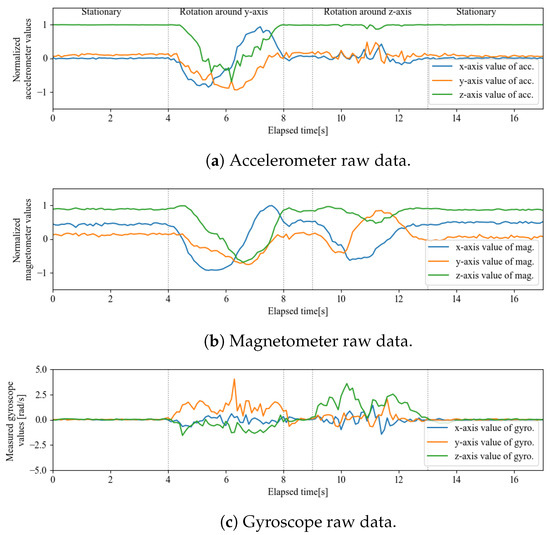 To summarize this subsection, a sensor fusion method for the 9-axis sensors using a stateful rotor is proposed. The algorithm developed adheres to the design concept of implementation by a multiply–add operation as much as possible, and the calculation method is suitable for embedded systems.