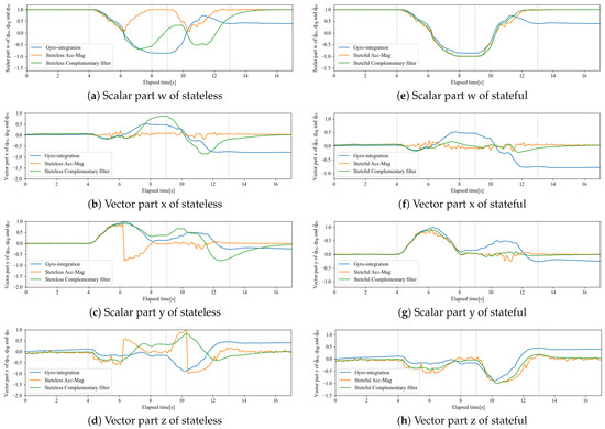 We performed simulations to compare the quaternion reconstructed from the accelerometer and magnetometer before and after transformation to statefulness. The item to be verified here was the four parameters of the quaternion by using stateful rotor maintained continuity for time-varying angles. In addition to the DCM used for sensor fusion, we also applied the stateful rotor to FQA and SAAM to confirm its applicability to other methods.