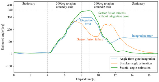 As shown in the results, for the stateless rotor and because of the state ambiguity caused by the double covering problem, the composite by the complementary filter failed. This failure resulted in angle estimates that were far from the true value or the gyro-integral value, which was close to the true value. Therefore, the conventional method stateless rotor can only be used to the extent that it does not exceed the point of discontinuity. On the other hand, the stateful rotor is able to track the rotation state well, even after a 360-deg rotation, and the estimated attitude angle is close to the gyro-integral value. In addition, the effect of the complementary filter eliminates the integration error remaining in the gyro-integral value, indicating that the sensor attitude angle can be estimated with good frequency response.