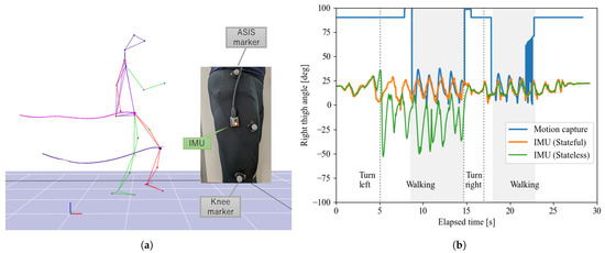 Measurement of walking motion using wearable IMU and optical motion capture. (a) Motion capture experiment (IMU placed on right thigh). (b) Comparison among motion capture and stateful/less IMU (shaded areas are within the motion capture measurement volume).