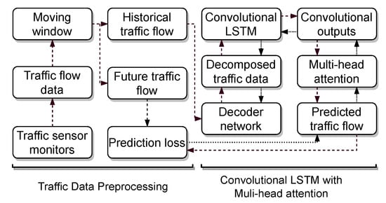 The advanced development of sensing technology makes big data more affordable and accessible, and thus, data-driven methods have been increasingly adopted for the predictive modeling of traffic flow. Data-driven methods can be classified into two categories: machine learning methods and deep learning methods [,,,,]. In comparison with machine learning methods, deep learning methods have gained more attention from both academia and industry in traffic flow predictions due to their extraordinary prediction fidelity and robustness. Among these deep learning methods, artificial neural networks (ANNs) and autoencoder-based methods have been widely used for traffic flow predictions as these methods are capable of decomposing the original traffic flow data into features located at a higher dimensional feature space, and these high-dimensional features can reveal the latent information in the traffic flow data. However, there are two primary issues for ANNs and autoencoders: (1) they can not take the temporal correlation of traffic flow data into account; (2) they can not consider the correlation of the extracted high-dimensional features. To consider the temporal correlation of traffic flow data, deep learning methods with recurrent characteristics are adopted, such as long short-term memory (LSTM), recurrent neural network (RNN), and gated recurrent unit (GRU). While these deep learning methods with recurrent characteristics are promising, they are not able to use the most relevant part of the traffic flow data to make predictions, which leads to a higher prediction time and a worse prediction accuracy. To address these issues, this work introduces a novel deep learning-based framework to consider the temporal correlation of traffic flow data, the correlation of the extracted high-dimensional features, and the most relevant part of the traffic flow data to make predictions in a unified manner. More specifically, a decoder network is firstly proposed to decompose the traffic flow data into high-dimensional features. Second, a convolutional LSTM network is introduced to simultaneously consider the correlation of the decomposed high-dimensional features and the temporal correlation of traffic flow data, where the convolutional operation is used to consider the correlation of the high-dimensional features, and the LSTM network is used to consider the temporal correlation of traffic flow data. Next, the multi-head attention mechanism is introduced to use the most relevant portion of the traffic data to make predictions so that the prediction performance can be improved. The primary contribution of this work can be summarized as follows: