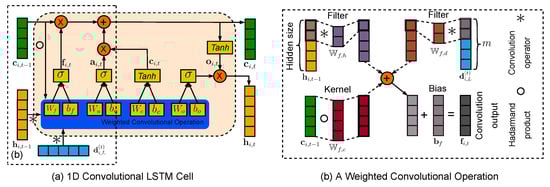 The framework of the one-dimensional convolutional LSTM cell with weighted convolutional operations, where (a) is the 1D convolutional LSTM cell and (b) gives an example of the weighted convolutional operation.