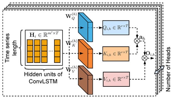 In summary, the convolutional LSTM cell integrates the convolutional operations with the traditional LSTM cell, where the convolutional operations are adopted to consider the correlation of the decomposed high-dimensional features and the traditional LSTM cell is utilized to extract the temporal correlations of traffic flow data. The integration of the convolutional operation with the traditional LSTM cell allows the neural network to consider both the correlation of the decomposed high-dimensional features and the temporal correlation of traffic flow data. Next, the hidden outputs, for all t, of the convolutional LSTM cell are fed into the multi-head attention mechanism for the final prediction.