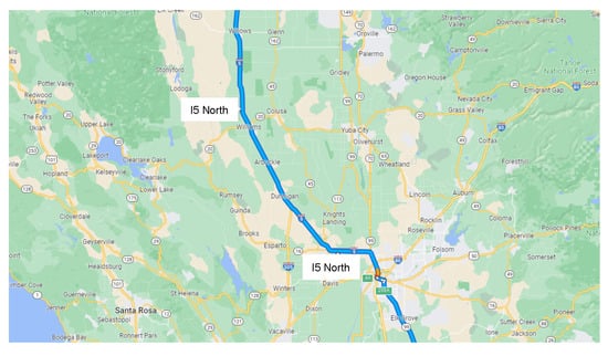 Traffic flow data collected by the Caltrans Performance Measurement System (PeMS) was utilized to demonstrate the effectiveness of the proposed methodology. The dataset was collected in real-time from over 40,000 unique detectors located on the freeway in the state of California []. The collected dataset aggregated hourly traffic flow data obtained from the corresponding detection station. In this study, we used two cases to demonstrate the effectiveness of the proposed method. The first case used the traffic flow data collected from January to March in the year 2022 located at the I5-North freeway, where the post-mile range is from 495.73 to 621.42 in the state of California. The second case used the traffic flow data collected from February to April in the year 2022 located at the I5-North freeway, where the post-mile range is from 495.73 to 621.42 in the state of California. The post-mile refers to the range of routes that move through individual counties in the state of California. For both two cases, the data for the first two months were used to train the proposed deep learning model, and the remaining month was used to test the proposed model. Figure 4 highlights the range of the post-mile 495.73 to 621.42 at the freeway I5-North. To avoid loss of generality, both training and test data were standardized. In this work, we use the data rescaling method to standardize all data to guarantee that both vehicle miles traveled (VMT) and vehicle hours traveled (VHT) are on the same scale. The data rescaling method refers to multiplying each data point by a constant factor, where the factors for VMT and VHT are and , respectively.