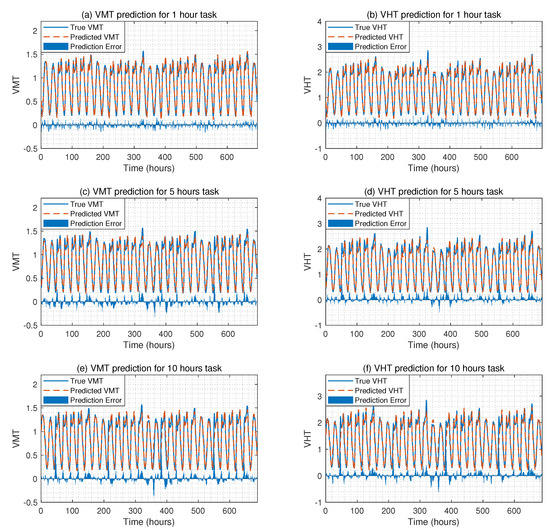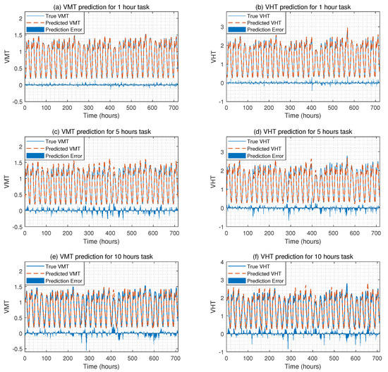 The VMT and VHT prediction results for three different tasks under the second case, where (a,c,e) show the VMT predictions for three tasks; and (b,d,f) show the VHT predictions for three tasks.