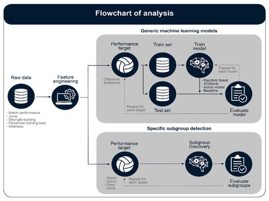 In this study, we considered techniques that model all performance scores, in addition to discovering important predictors that distinguish between good and bad volleyball performance. Because the size of our data sets was small compared to the number of predictors, we had to limit the number of predictors included in our model to minimize the risk of overfitting. Therefore, applied machine learning regression techniques model volleyball performance by selecting only the most important predictors. Figure 2 shows a flow chart of our entire methodology.