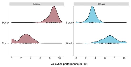 The distributions of overall match performance of the offensive and defensive actions are displayed in Figure 3. For the defensive actions, the block scores were 2.7 ± 1.5, and the pass scores were 8.6 ± 0.9. Thus, the average probability of scoring a point is higher for passes than for blocks. Moreover, the variation in the block scores is larger than for passes.