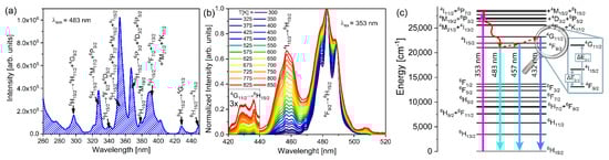 Figure 2a shows the excitation spectrum of YAP: 2 mol% Dy3+ that was obtained by observing the most intense emission attributed to the 4F9/2→6H15/2 transition (λem = 483 nm). Further, this is where the characteristic 4f intra-configurational peaks of Dy3+ ions are present at typical positions [30,31,32]: 6H15/2 → 4H11/2 + 4G9/2, 6H15/2 → 4M17/2 + 6P3/2, 6H15/2 → 4F5/2 + 4D5/2, 6H15/2 → 4I11/2 + 6P7/2 + 4M15/2 + 4I15/2, 6H15/2 → 6P3/2 + 4D3/2 + 6P5/2, 6H15/2 → 4M19/2, 6H15/2 → 4F7/2 + 4I13/2 + 4M21/2 + 4K17/2, 6H15/2 → 4G11/2, and 6H15/2 → 4I15/2 at ca. 295 nm, 330 nm, 340 nm, 353 nm, 370 nm, 380 nm, 390 nm, 430 nm, and 450 nm, respectively.