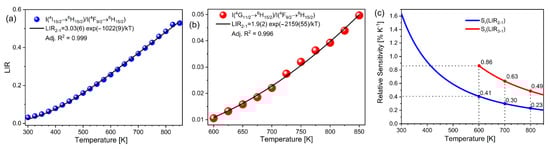 The fits to Equation (1) are shown in Figure 3a (LIR1) and Figure 3b (LIR2). The high fit quality proves that thermalization is effective and follows a Boltzmann distribution, for both LIR1 and LIR2. As SR (Equation (2)) depends only on the energy difference between levels at a given temperature, the improvement in relative sensitivity for LIR2 in comparison to the traditional, two-thermalized levels LIR1, is linearly proportional to the ratio of the energy difference. The obtained SR values for LIR1 and LIR2 (Figure 3c) decreased with temperature, as Equation (2) predicts, and the relative sensitivity of LIR2 outperforms that of LIR1 by approximately two times at high temperatures. Alas, the approach using the third, higher energy level has its temperature limitations—those at which the emission intensity is not significant enough to be utilized for luminescence thermometry (lower temperature limit) and those at which temperature quenching of the corresponding emissions starts (upper temperature limit). In Dy3+- activated YAP, the lower temperature limit for LIR2 was ~600 K where the calculated SR values have the maximum of 0.41% K−1 (LIR1) and 0.86% K−1 (LIR2) (Figure 3c). Additionally, another limitation is the choice of host materials—temperature quenching should not start before higher excited levels are thermalized; thus, hosts can only be materials that are chemically stable at higher temperatures (such as yttria-stabilized zirconia, vanadates, garnets, silicates, and phosphates) [33,34,35,36]. At 850 K the emission intensity from the highest thermalized level was still increasing. Unfortunately, we could not reach the upper temperature limit for this luminescent thermometer probe due to the limitations of our heating stage.