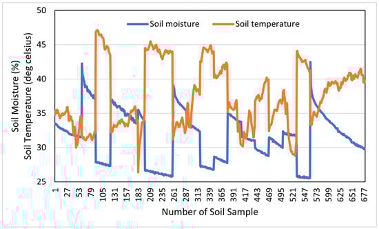 On the other hand, soil temperature can be considered a good feature for predicting SM. It is comparatively more easy to measure surface soil temperature than soil moisture [64]. Figure 1 shows the plot of soil temperature and corresponding soil moisture in our considered dataset. From this figure, it can be seen that SM has an inverse relationship with soil temperature. We calculated the Pearson’s correlation coefficient between SM and soil temperature, and found that these two parameters are negatively correlated (−0.79). Therefore, soil temperature has a noticeable impact on SM.