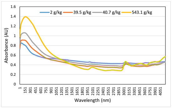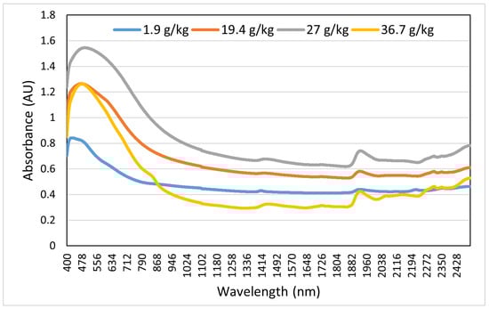 After laboratory analysis of each sample, the absorbance from 400–2499.5 nm was recorded using a FOSS XDS Rapid Content Analyzer (FOSS NIRSystems Inc., Denmark) [34]. We recorded 4200 absorbance bands at 0.5 nm intervals. For this purpose of this study, we considered only the Swedish dataset, which consisted of 1891 soil samples. The dataset specifies the corresponding soil samples (point ID) with different properties such as clay, silt, sand content, pH, coarse fragments, SOC, NC, etc. The box plots in Figure 5 and Figure 6 show the interquartile range and the outlier ranges of SOC and NC, respectively. Figure 7 and Figure 8 represent the absorbance curves of different values of SOC and NC, respectively. The lowest, highest, and average range of SOC and NC was considered for simplicity. Figure 7 shows that the absorbance increases with increasing SOC and decreases with decreasing SOC in the HS band range from 400 nm to 1000 nm. However, this trend is not followed after 1000 nm to 2500 nm. On the other hand, the absorbance increases with increasing NC; however, when the value of NC is high (36.7 g/kg), the absorbance curve becomes different. The absorbance curve of NC is shown in Figure 8.