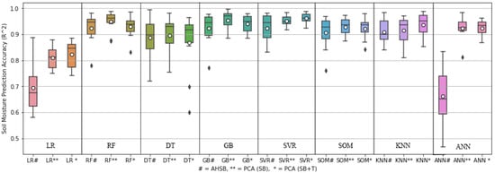 Figure 11 shows the comparison box plot of eight different ML models considering three criteria: i. AHSB, ii. PCA on SB, and iii. PCA analysis of SB, including soil temperature. This figure is drawn considering ten-fold cross-validation, and for each iteration the results indicate the best, worst, mean, and median performance of each ML model for predicting SM. Therefore, this box plot reflects the results of ten-fold cross-validation used to validate our model. The circle and cross-line on the box show the mean and median, respectively. When PCA analysis of SB is considered with and without the effect of temperature, the SM prediction accuracy improves, and the best and worst prediction ranges become shorter compared with AHSB. This prediction improvement is noted for all the ML regressions we considered. SVR provides the best average prediction accuracy, with minimal fluctuation in the prediction range.