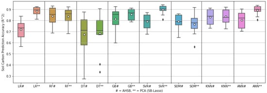 However, the value of MAE and RMSE was significantly large due to the inhomogeneity of the data sample [69]. It is important to consider checking the data homogeneity before beginning machine learning or statistical operations. Homogeneous data should remain in a constant trend with the changing parameters that may affect the data. However, in practice, this is almost impossible to obtain for soil data samples. From Table 3, it can be noticed that the prediction accuracy in terms of is satisfactory. However, there are high and errors due to the wide variation of the SOC soil sample. Figure 12 considers AHSB and PCA of SB in order to better understand the fluctuation range of prediction, illustrating that PCA with SB shows less fluctuation and better SOC prediction.