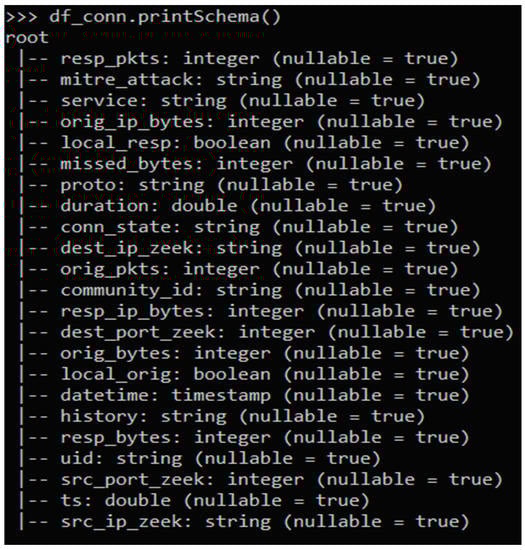 Zeek’s Conn log file tracks the protocols and associated information, such as IP addresses, durations, two-way bytes, states, packets, and tunnel information. In short, the Conn log files provide all the data regarding the connection between two points. The full list of the attributes (and attribute types) of the Conn log file is presented in Figure 1. The “mitre_attack” attribute was added to label the data as per the MITRE ATT&CK framework. A description of the attributes in the Zeek Conn Logs file is presented in Appendix A.