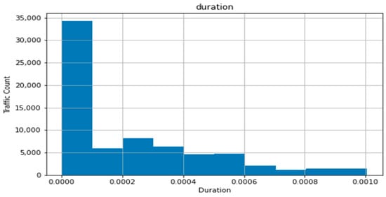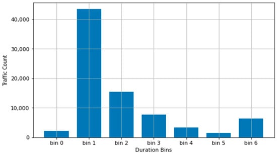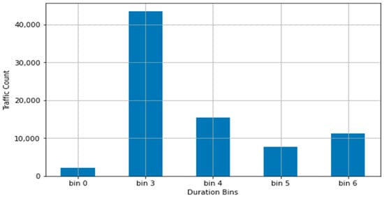 The bin ranges were used in conjunction with the PySpark ML Bucketizer function to convert the respective columns into a limited range of integer values. The resulting bins and distribution for the duration column, using the above binning outline, are presented in Table 3 and Figure 2.