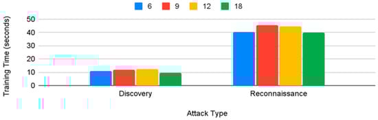 From Figure 11, we can also note that the training time was lower, on the average, for six attributes. Therefore, for reconnaissance, the top six attributes (history, protocol, service, orig_bytes, dest_ip, and orig_pkts) would be enough to classify the reconnaissance tactic for any of the classifiers except SVM.