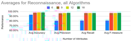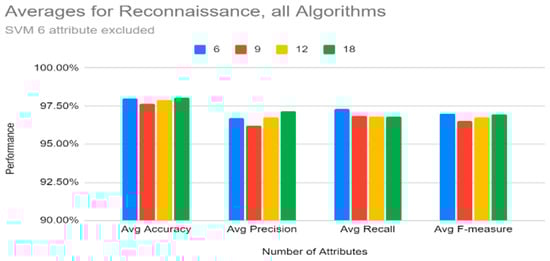 Figure 12 shows that, for reconnaissance, on average, 6 attributes performed slightly lower than 9, 12, and 18 attributes. However, a close look at Table 19 shows that this is because the SVM results for six attributes are not consistent with the rest of the results; hence, Figure 13 shows averages for reconnaissance without SVM (note that SVM was just removed from the six attribute list). Without SVM’s six attributes, all the other results are higher for six attributes.