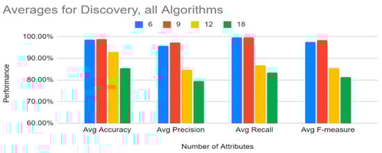 Figure 14 shows that, for discovery, on average, 18 attributes performed the lowest, and though 6 and 9 attributes performed closely, 9 attributes had slightly higher averages. However, since the top six attributes (history, protocol, service, orig_bytes, dest_ip, and orig_pkts) had results so close to the top nine attributes, the case could be made to recommend six attributes given that, in terms of training time as shown in Figure 11, six attributes performed better than nine attributes.