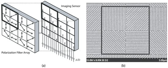 (a) Schematic of the basic structural unit of the polarization sensor array. (b) SEM image of four neighboring pixels with a micropolarizer array.