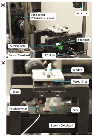 (a) Photograph of the high-speed polarization camera setup and modified drop tower. (b) Closeup of a tendon-to-bone insertion specimen in grips.